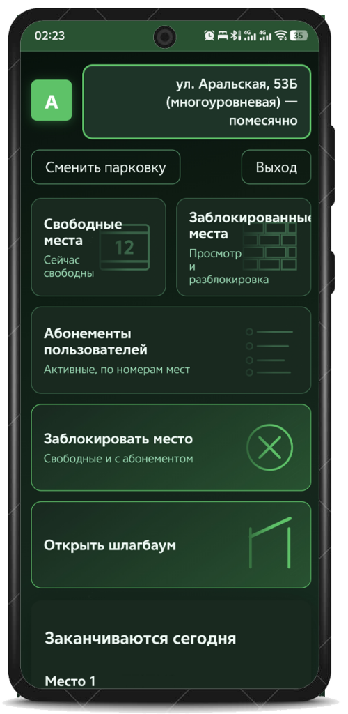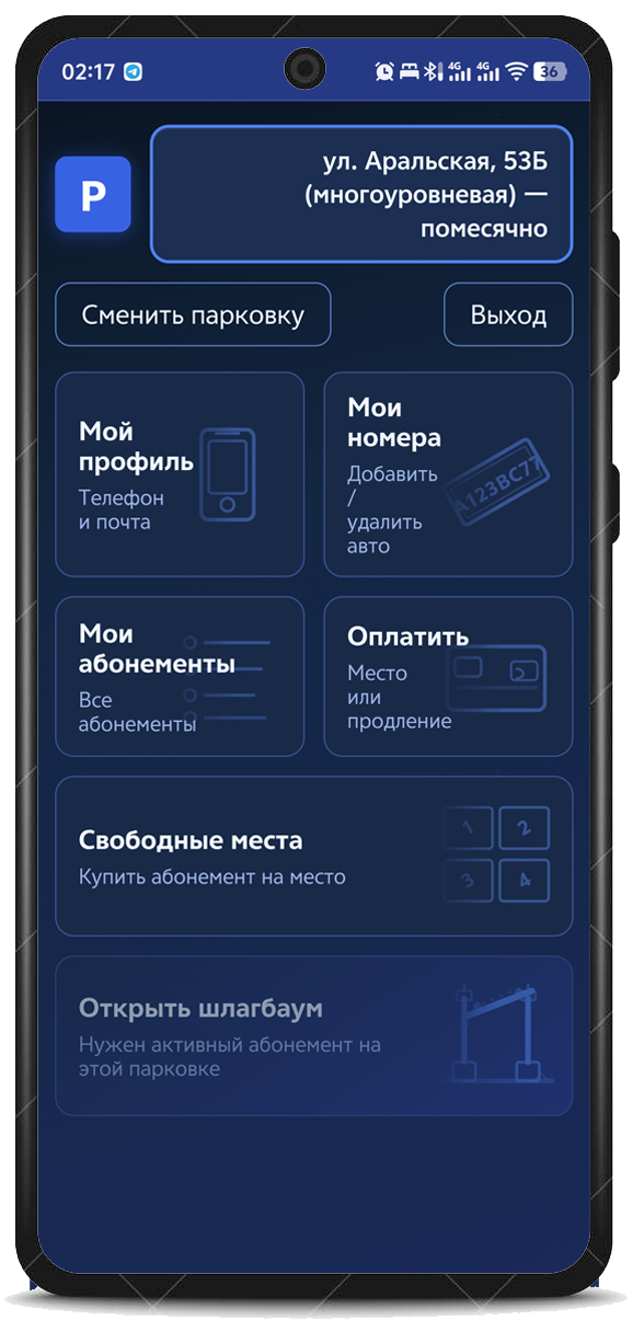 Весь жизненный цикл аренды места — от регистрации и оплаты до продления и ежедневного доступа — осуществляется через приложение. Пользователю не нужно звонить оператору, искать наличные, заполнять бумажные договоры или подстраиваться под график работы охраны. Регистрация новой машины, продление абонемента или открытие шлагбаума занимают минуты в любое время суток.